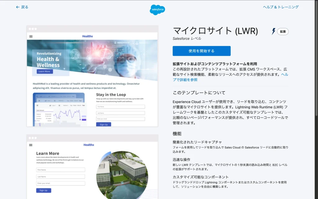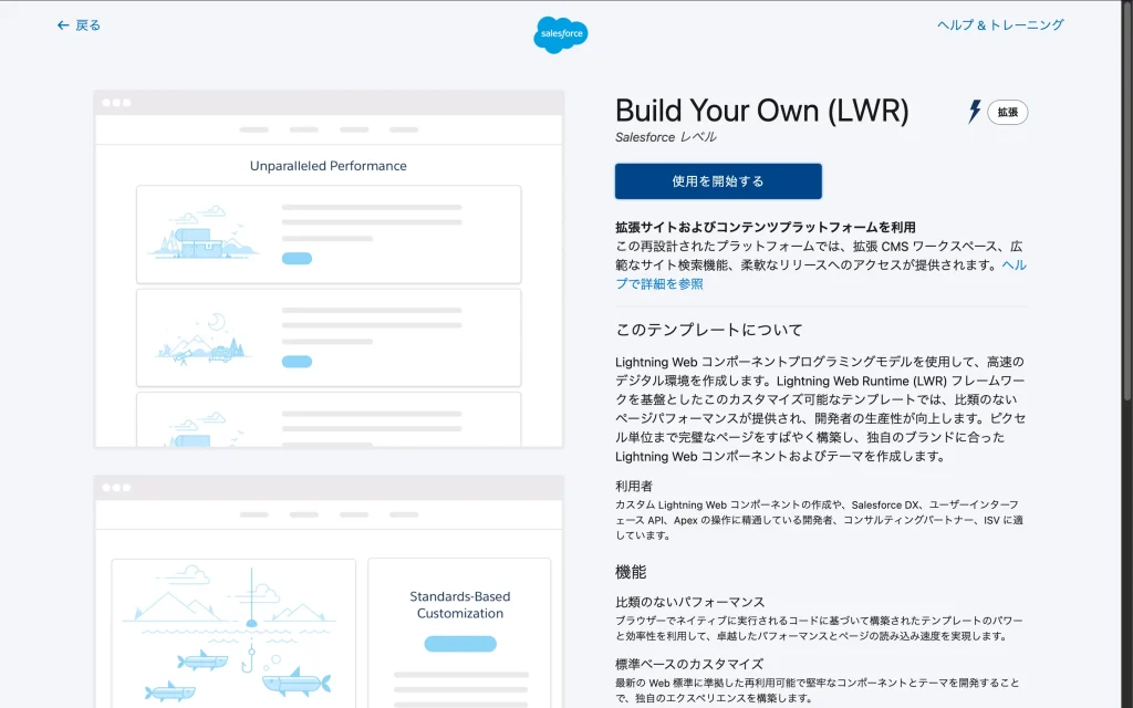 - Build Your Own (LWR) は、Salesforceデータを活用した本格的なWebアプリケーションやポータルサイト向け。