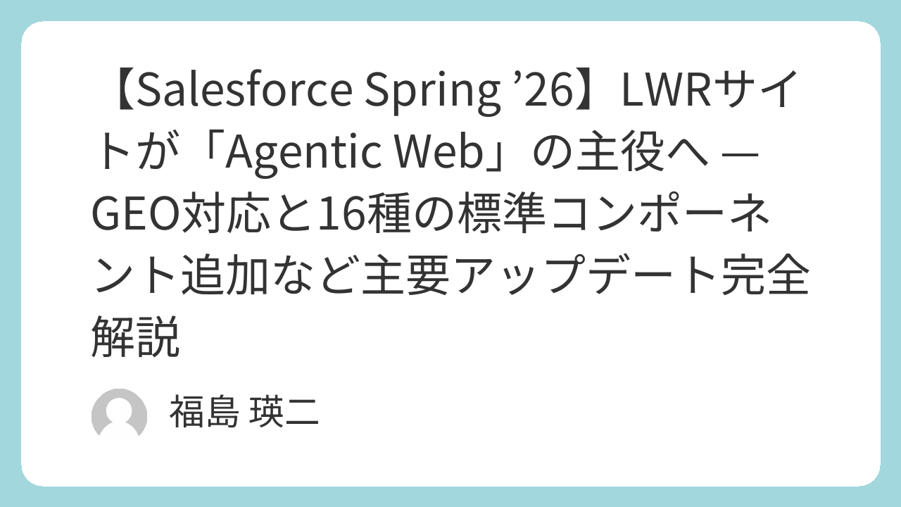 Salesforce Spring ’26は、LWRサイトが「Auraの軽量版」から「次世代の標準」へと完全に脱皮するリリースと言えます。 特にGEOへの対応は、AI時代のWebサイト運用において避けて通れない要素です。また、標準コンポーネントの大幅拡充は、開発工数を削減し、より本質的なビジネスロジックやAI活用(Agenticな機能)の実装にリソースを集中させることを可能にします。