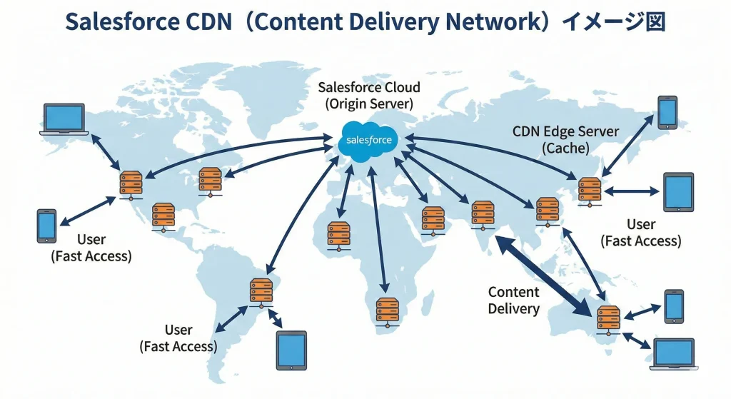 Salesforce CDN(Content Delivery Network)は、Webサイトの画像、CSS、JavaScriptファイルなどの静的コンテンツを、世界中に分散配置された多数のサーバー(エッジサーバー)にコピーして保存(キャッシュ)する仕組みです。