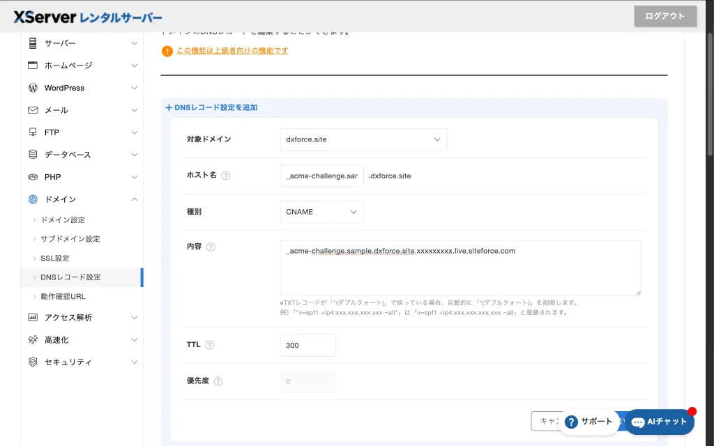 多くのトラブルは、この _acme-challenge のスペルミスや、アンダースコア(_)の抜けによって発生しています。慎重に入力してください。