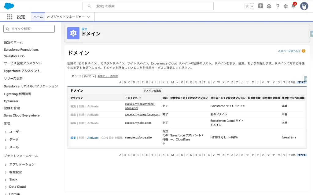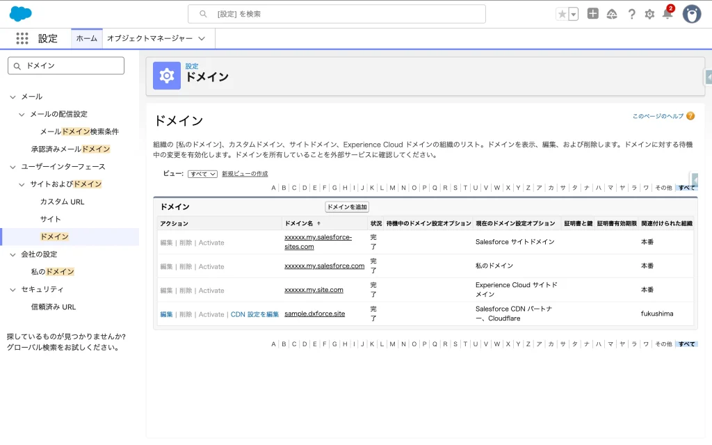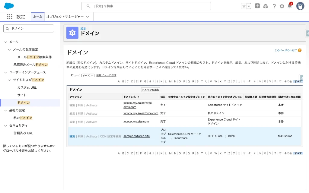まず、Salesforce本番環境でドメインを受け入れる準備を行います。