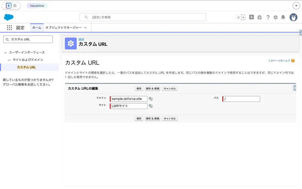 2. [新規カスタム URL] ボタンでドメインとExperience Cloudサイトを紐付けます。