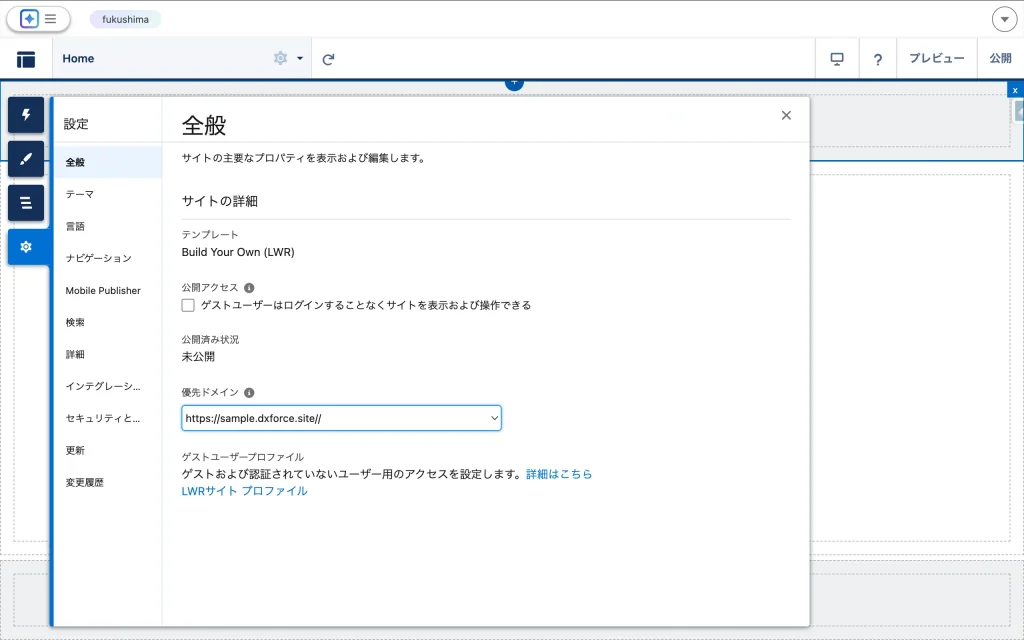 エクスペリエンスビルダーを開き、[設定] > [全般] > [優先ドメイン] で、設定したカスタムドメインを選択して公開します。これにより、検索エンジンに対して正規のURL(カノニカルタグ)を明示でき、SEO評価の分散を防げます。