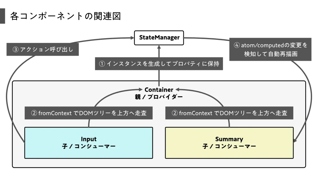 • プロバイダー(親)のルール: コンポーネントがDOMに接続される前(初期化時)に、状態マネージャーのインスタンスを生成して自身のプロパティに保持しなければなりません。