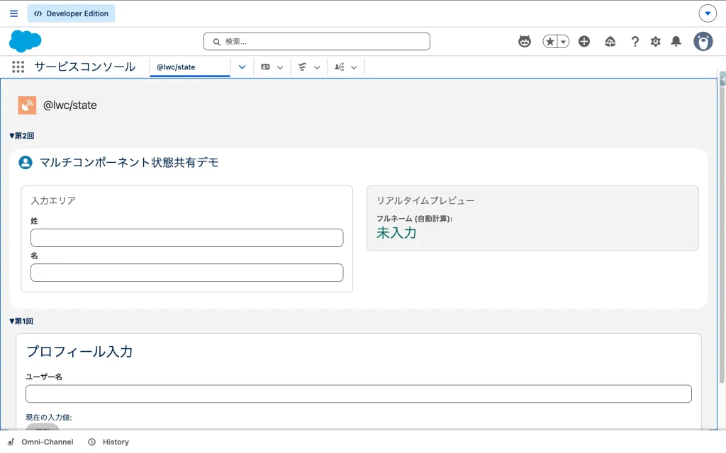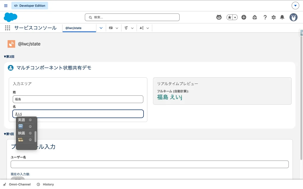 画面を開くと、左側の「入力エリア」と右側の「プレビュー」が並んで表示されます。 入力エリアに文字を打ち込むと、CustomEventを一切発行していないにも関わらず、右側のプレビュー画面にあるフルネーム(computedによる自動計算結果)がリアルタイムに更新されます。