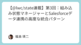第1回では、@lwc/stateの基本となる4つのプリミティブ(defineStateatomcomputedsetAtom)を用いて、単一のコンポーネント内でUIとビジネスロジックを分離する方法を学びました。