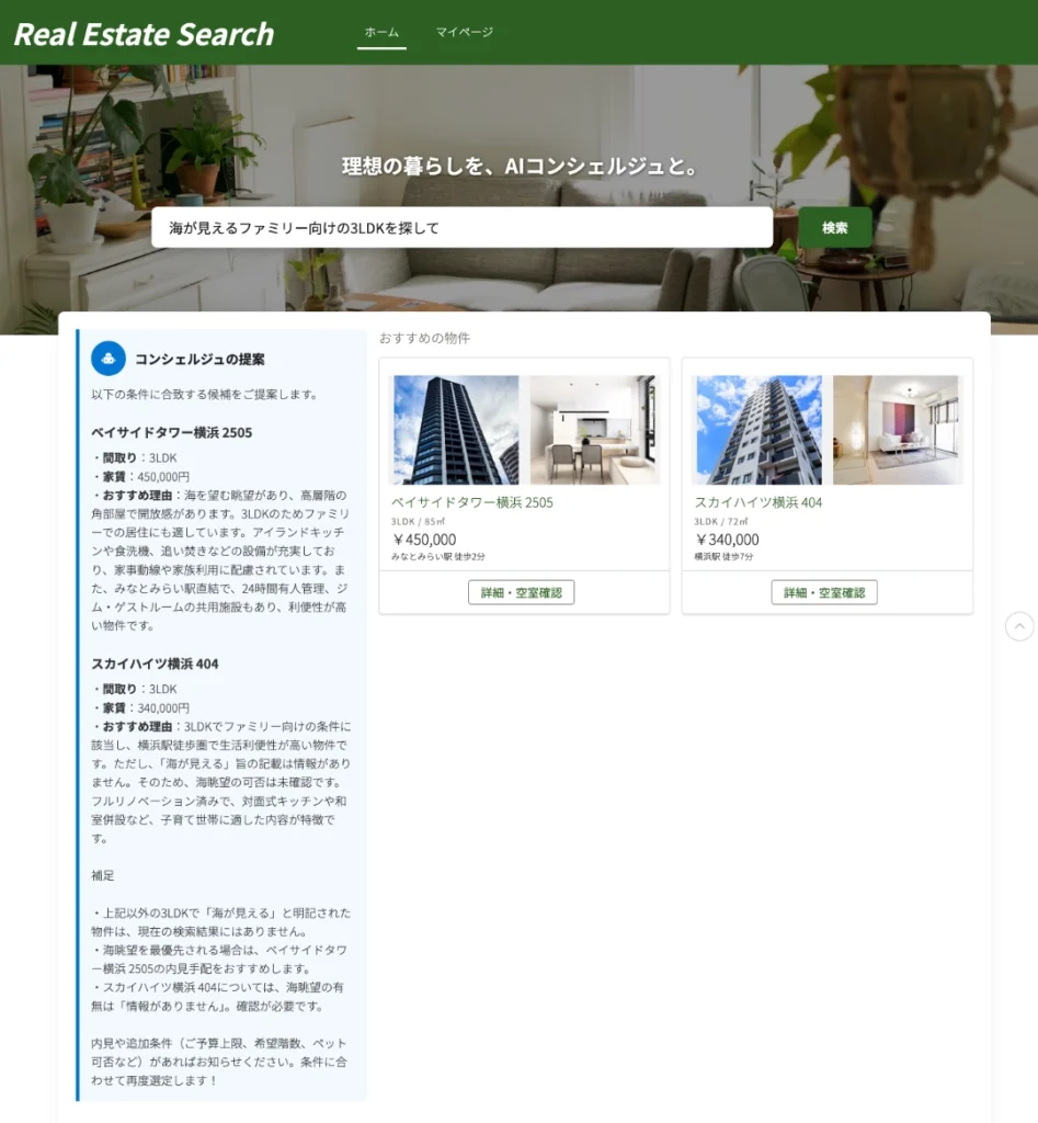 ヒーローエリア(トップ画像)の中に検索バーがあり、自然言語で検索できます。 AIからの回答(左)と、抽出された物件カード(右)が並んで表示されます。