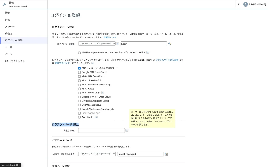 - [ログアウトページ URL] の項目で、ログアウト後のリダイレクト先(例: ログインページや特定のWebサイト)を指定します。指定しなければ通常のログイン画面に戻ります。