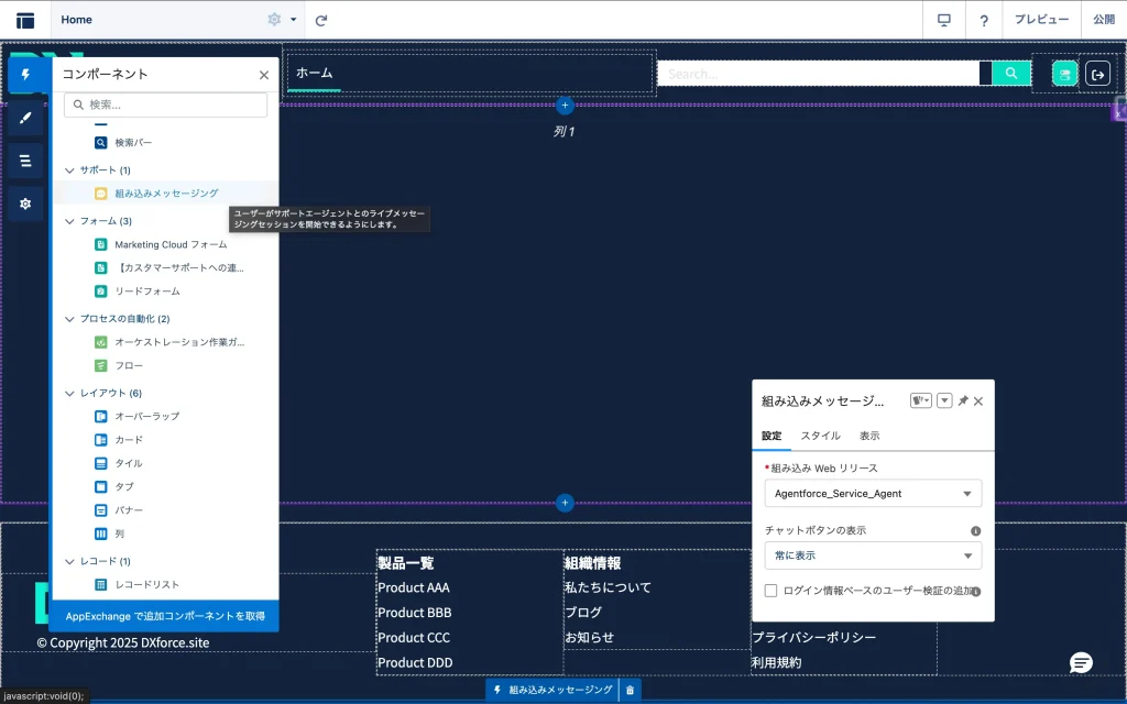 1. エクスペリエンスビルダー: 「組み込みメッセージング」コンポーネントをドラッグ&ドロップで配置。