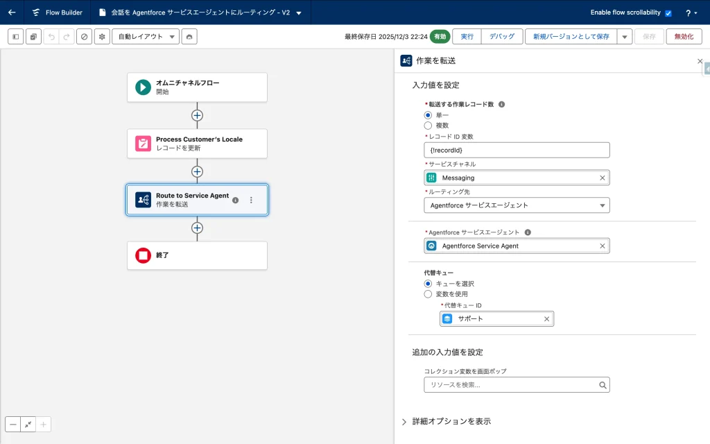2. オムニチャネルフロー: チャットのルーティングを制御。ここで「Agentforce Service Agent」へ会話を渡します。