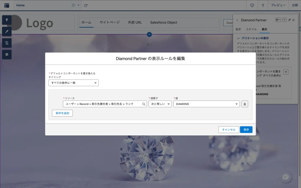 - 作成したバリエーション(例:Diamond Partner用)を選択した状態で、[表示 (Visibility)] タブを開きます。